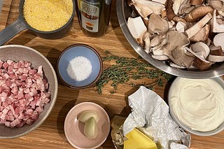 Oven polenta with many mushrooms, crème fraîche, and crisp-fatty pancetta