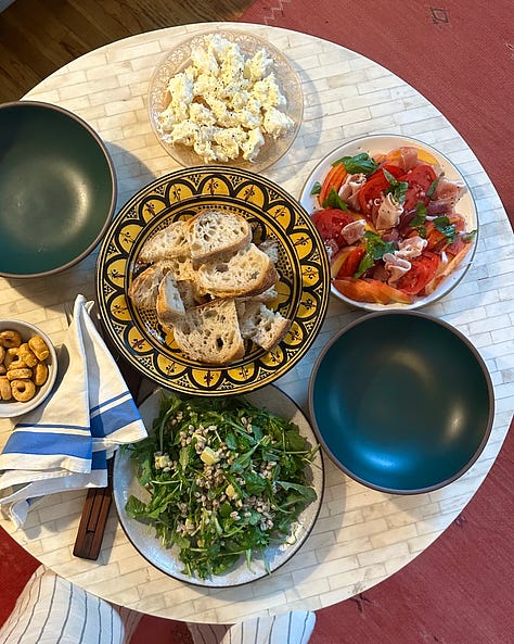 My friend Devra is a poised and frequent host, and a source of much kitchen inspiration. I recently rounded up some favorite photos of meals she’s cooked for me over the past several years and shared them on Instagram. As I looked through the images, I noticed that many of the meals we’ve shared have followed a similar formula: one bread, one cheese, and a few different seasonal salads. We graze on everything laid out on the table, refilling our plates as we wish, and I always leave her apartment feeling nourished but not weighed down. This, I think, is the perfect way to eat.