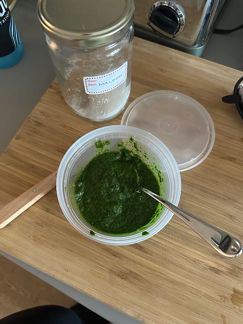 Turning the wilting spinach and herbs in our fridge into a punchy sauce for sandwiches and roasted vegetables