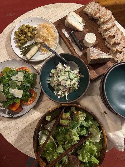 The formula of bread + cheese + salads offers a framework for planning a menu while leaving room for endless variation. One day the bread might be focaccia, the next a baguette; the cheese can be whatever you’re craving or whatever the cheesemonger suggests; and the salads should follow the seasons, changing with what’s freshest. When bread and cheese are served as part of the meal, I find that I feel satisfied enough that I don’t long for fish or meat, which is a win-win-win: for my health, the planet’s health, and my wallet.