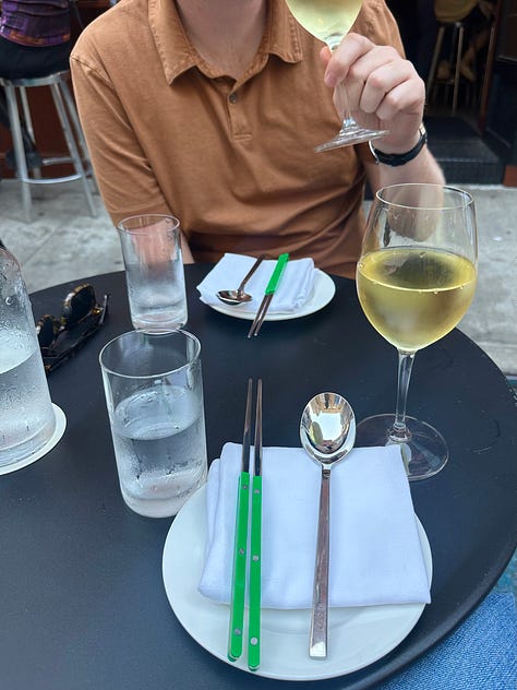 Stopping by Lei in Chinatown for a glass of wine and swooning over the green Sabre chopsticks