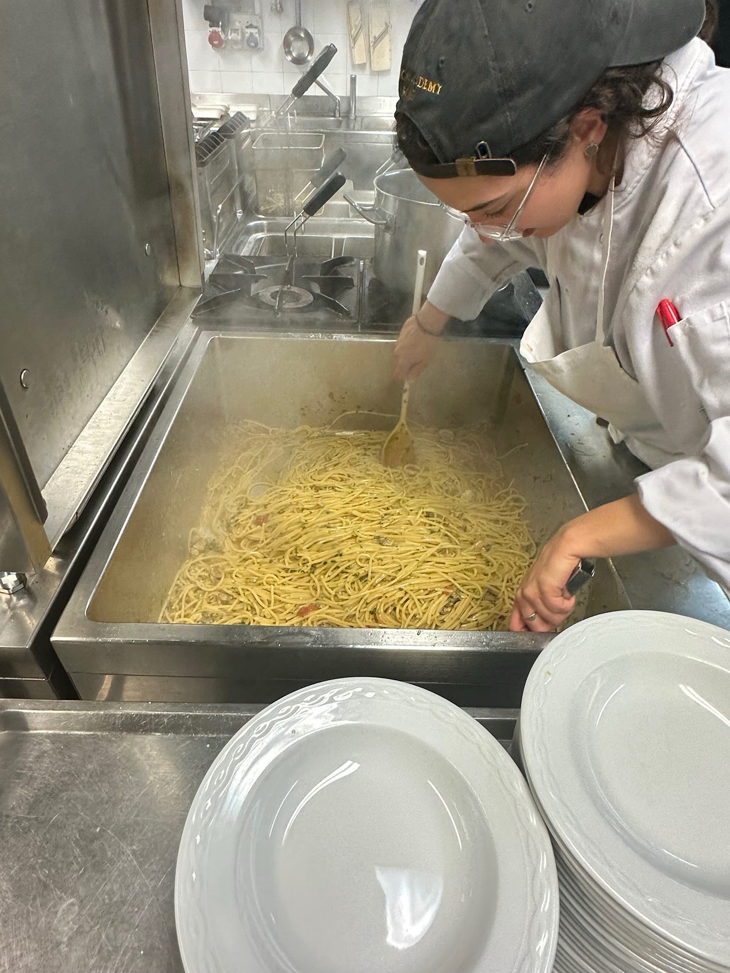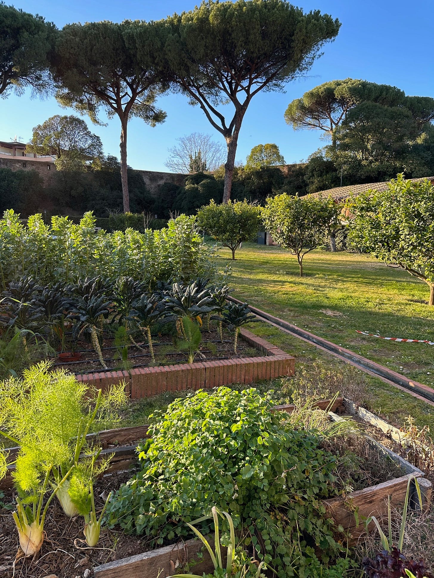 I don’t know how I’ve written 500 words about my week so far without mentioning the food, so let me start by saying that the food is exceptional. We have a garden with citrus trees and greens and herbs and so on, and we also receive produce from local farmers, like the one whose picture is framed on the kitchen wall so that we can all worship him daily. I love that the Rome Sustainable Food Project regards its producers so highly, and understands that good ingredients make good food. It’s as simple and complicated as that. The RSFP also does a fantastic job of reducing food waste by using every last bit of each ingredient and transforming scraps into delicious meals. In the mornings, we take any odds and ends from the fridge, set them all out on the counter, and decide what we’ll make for the Academy’s lunch. This kind of thrifty, creative cooking inspires me, and I have Hart’s to thank for showing me the way via family meal, day in and day out. Thank you, Hart’s, for that, and for the education on everything else related to professional kitchens.