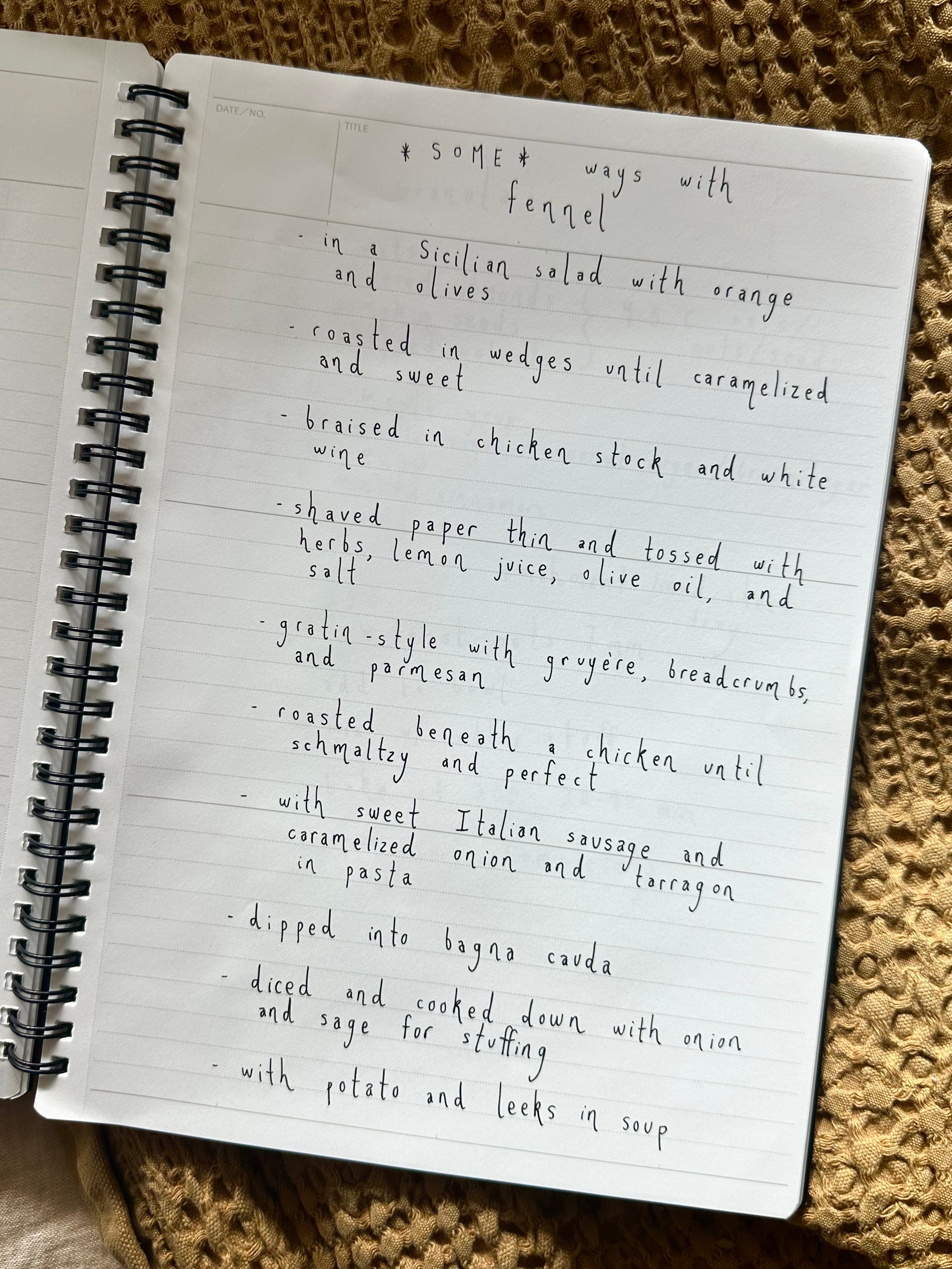 You see, fennel is many vegetables in one (dare I compare it to the many faces of an actress?). Really, I could write an essay about each of its forms. Instead, I’ll share a list of ideas for cooking with fennel, along with another for fennel seeds.
