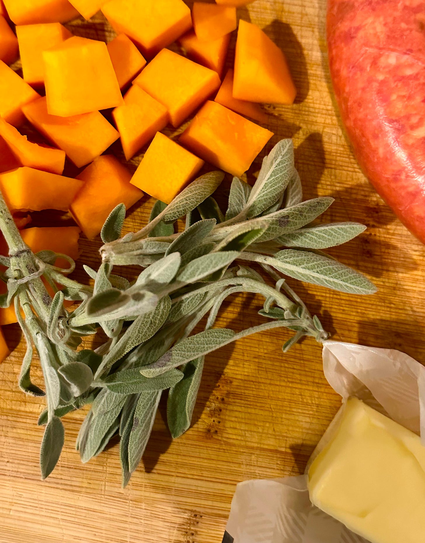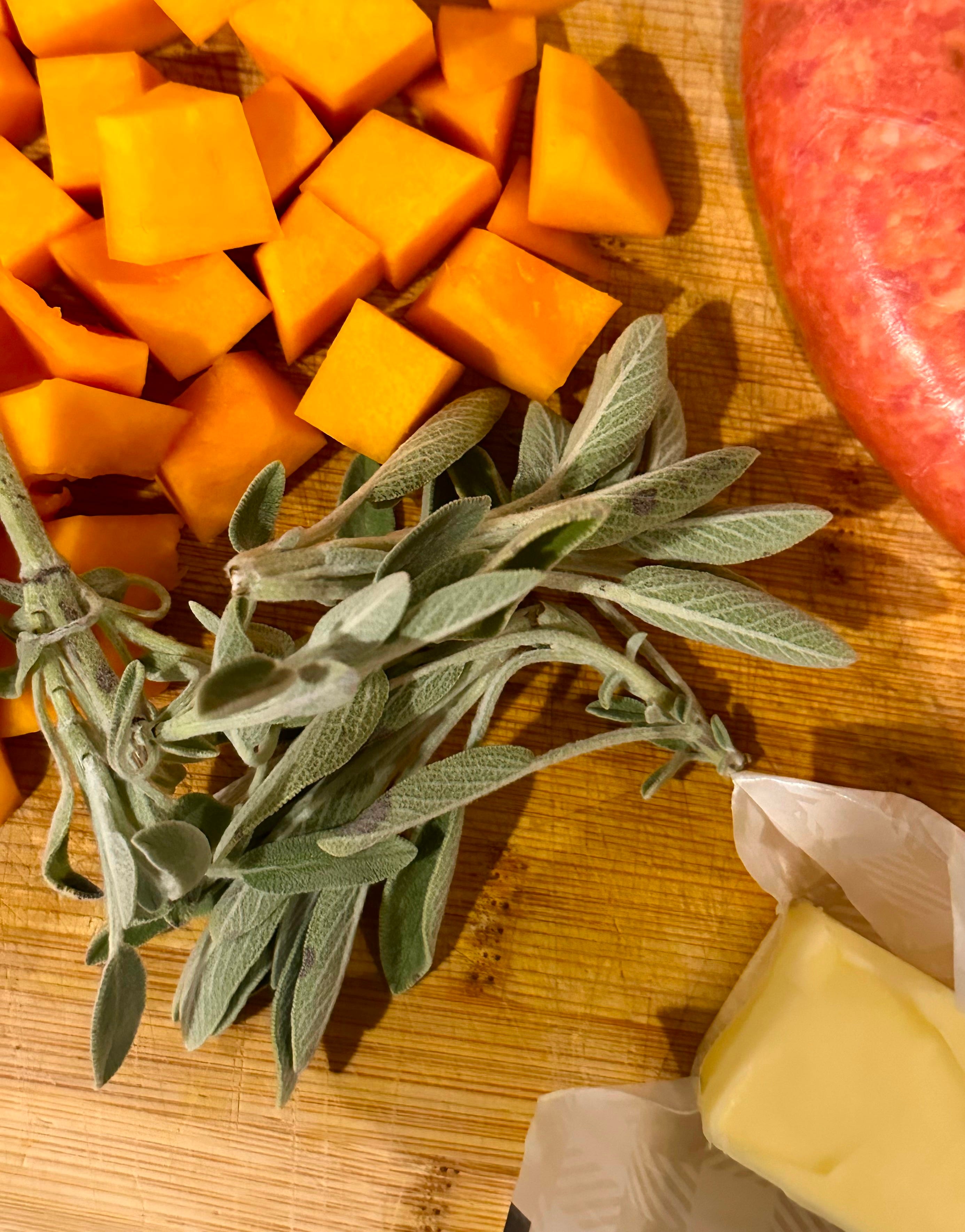 Add butter and several dry sage leaves to the same pot and cook until the butter has brown flecks and smells like heaven. Turn off the heat and add the roasted butternut squash and cooked sausage to the sagey brown butter.